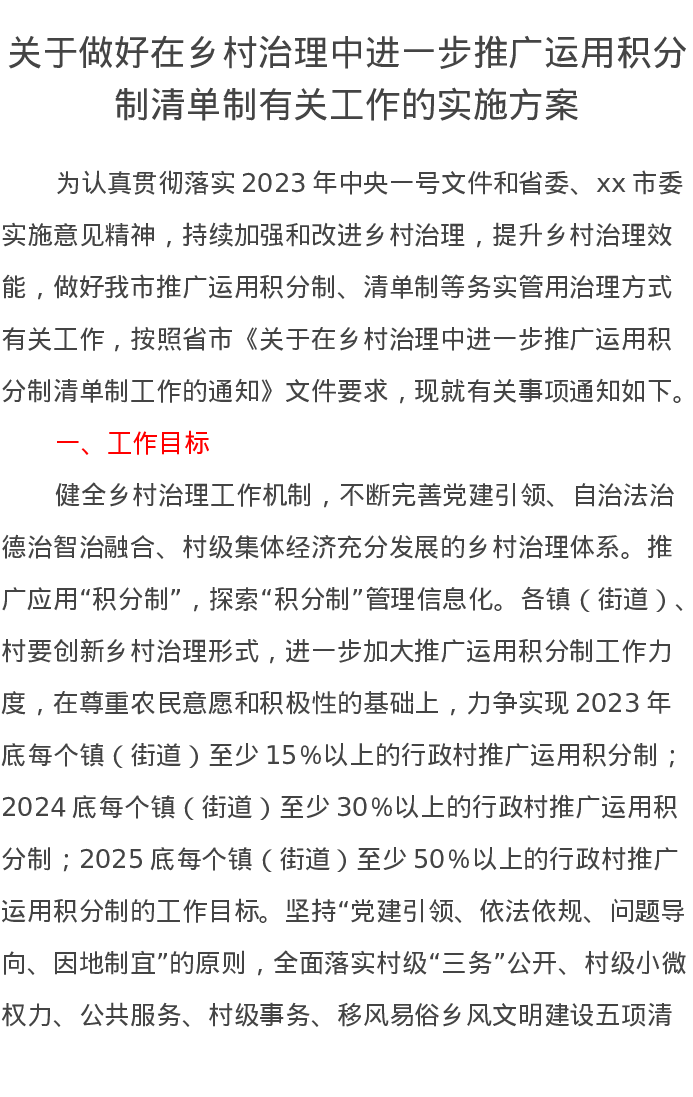 关于做好在乡村治理中进一步推广运用积分制清单制有关工作的实施方案