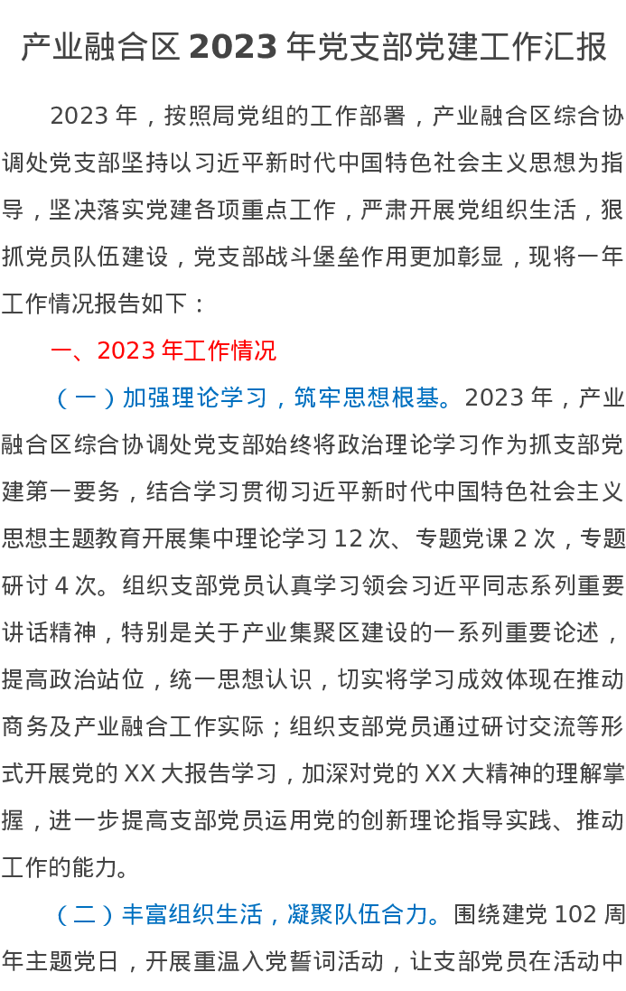产业融合区2023年党支部党建工作汇报