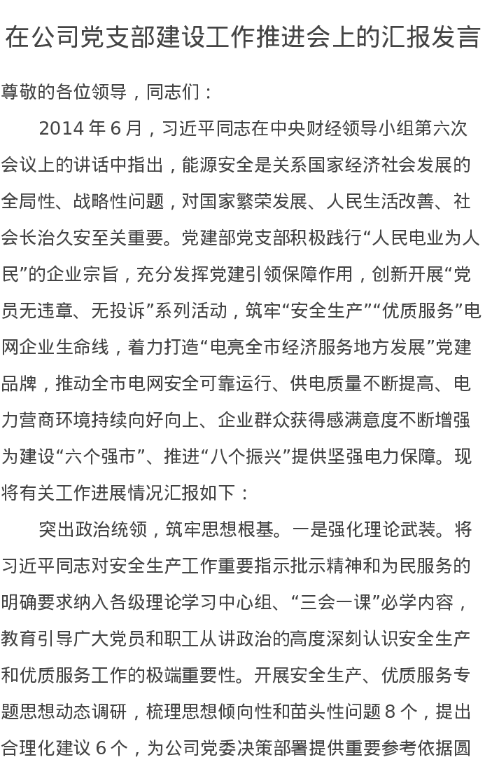 在公司党支部建设工作推进会上的汇报发言