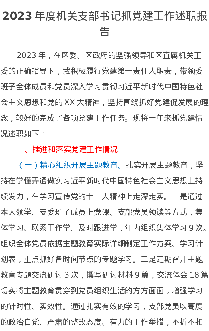 2023年度机关支部书记抓党建工作述职报告