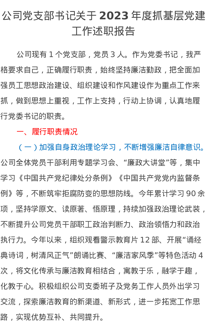 公司党支部书记关于2023年度抓基层党建工作述职报告