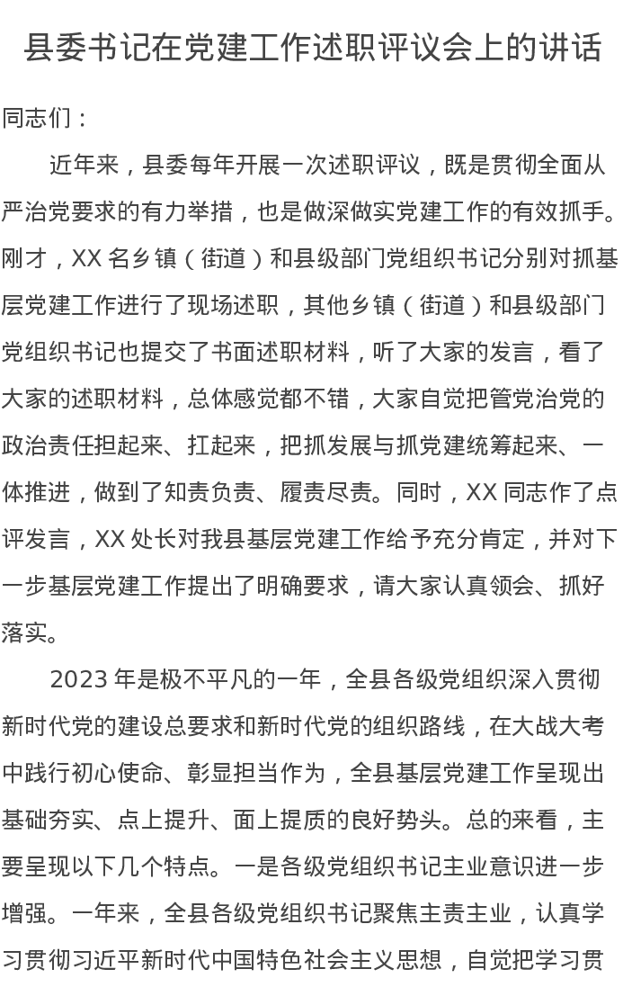 县委书记在党建工作述职评议会上的讲话