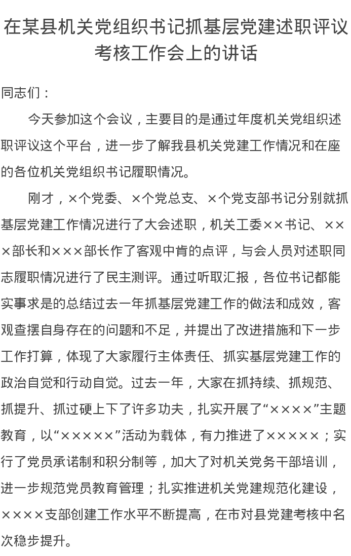 在某县机关党组织书记抓基层党建述职评议考核工作会上的讲话