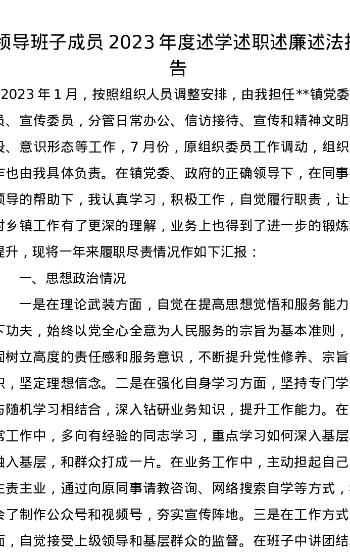 领导班子成员2023年度述学述职述廉述法报告
