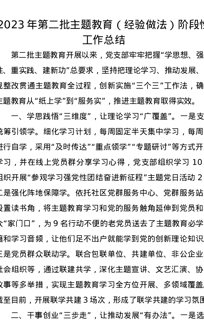 2023年第二批主题教育(经验做法)阶段性工作总结(特色社会主义思想)