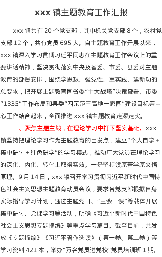 xxx镇第二批主题教育工作汇报(特色社会主义思想)