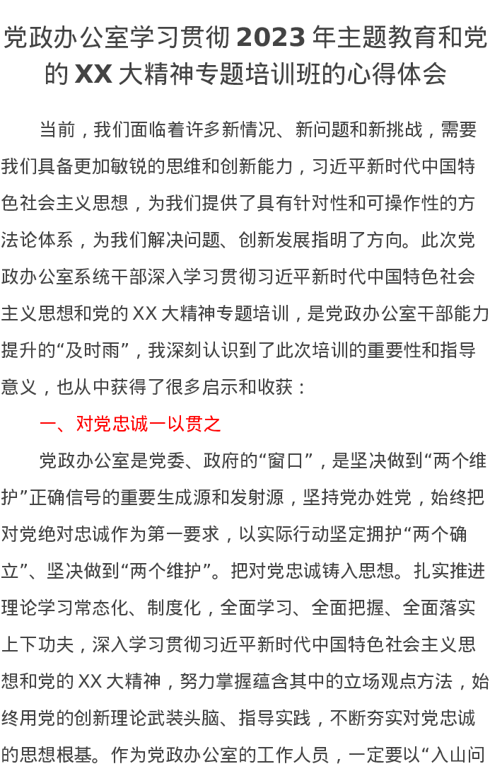 党政办公室学习贯彻2023年第二批主题教育和党的二十大精神专题培训班的心得体会(特色社会主义思想)