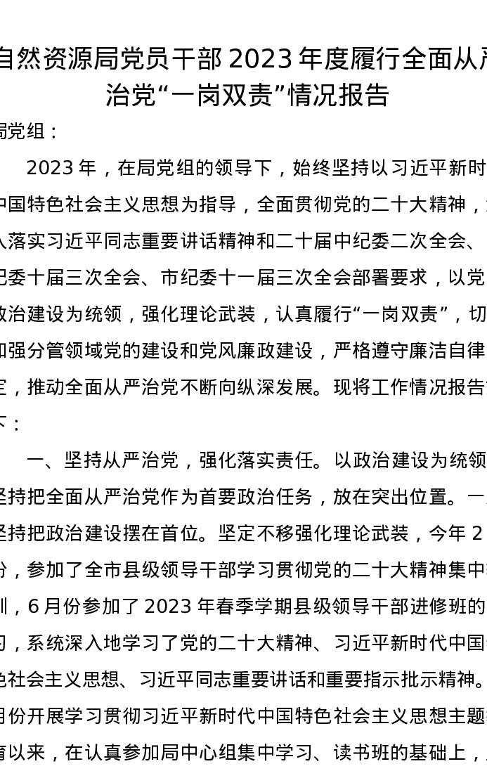 自然资源局党员干部2023年度履行全面从严治党“一岗双责”情况报告