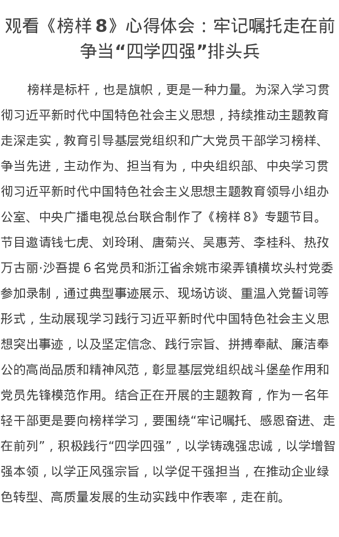 观看《榜样8》心得体会:牢记嘱托走在前,争当“四学四强”排头兵
