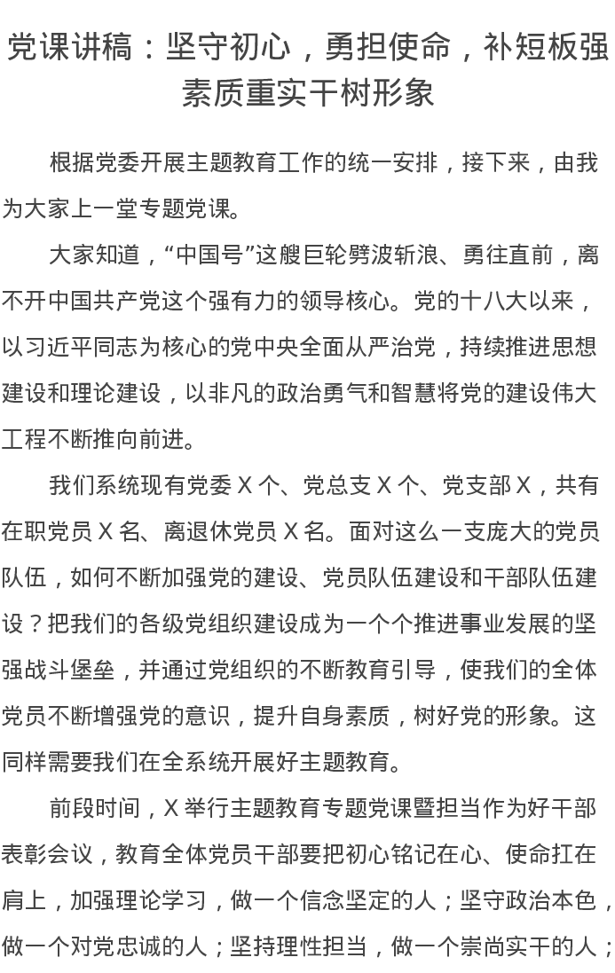 党课讲稿:坚守初心,勇担使命,补短板强素质重实干树形象