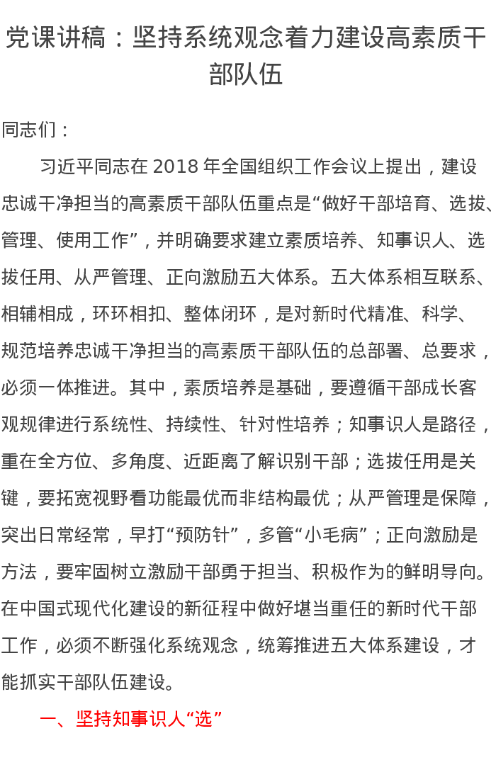 党课讲稿:坚持系统观念着力建设高素质干部队伍