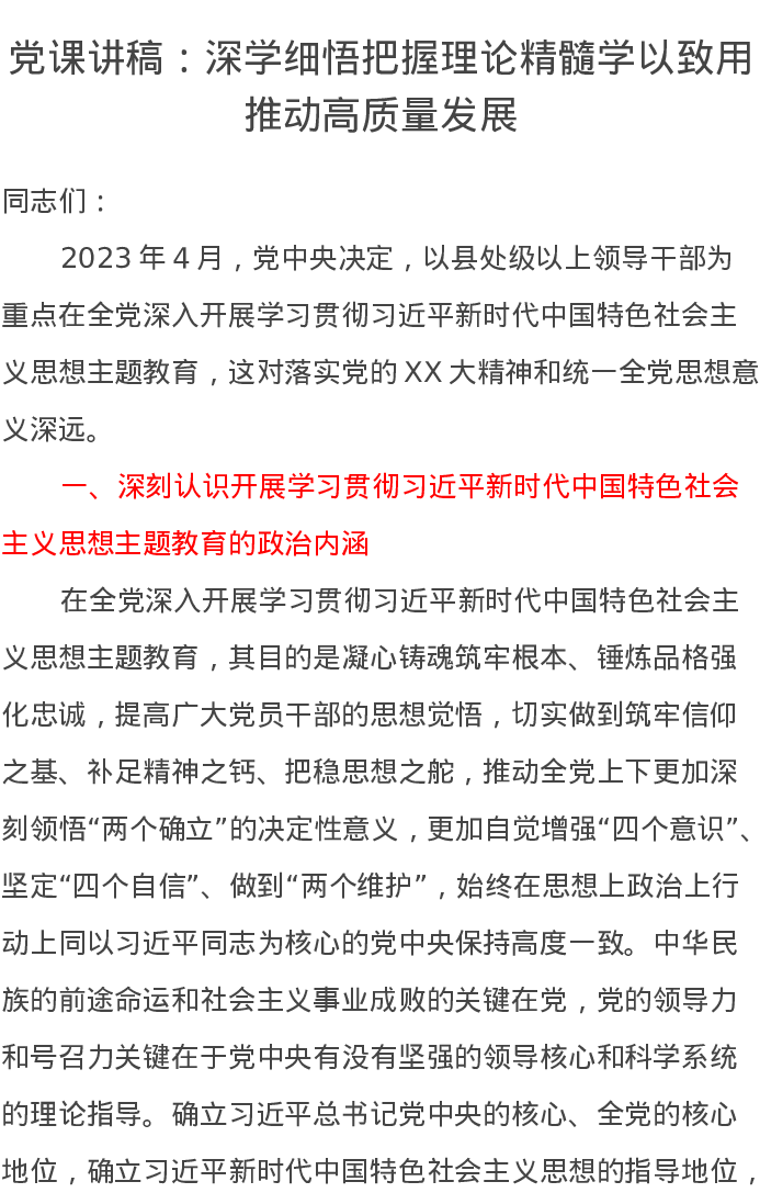 党课讲稿:深学细悟把握理论精髓学以致用推动高质量发展
