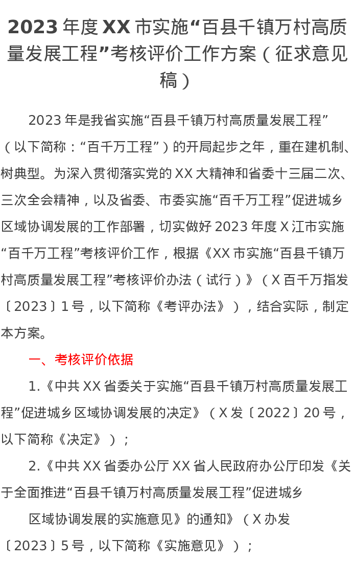 2023年度XX市实施“百县千镇万村高质量发展工程”考核评价工作方案(征求意见稿)