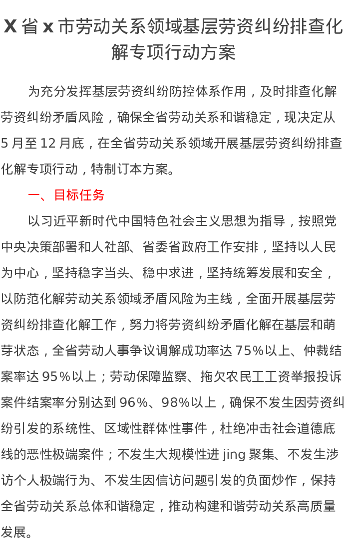 X省x市劳动关系领域基层劳资纠纷排查化解专项行动方案