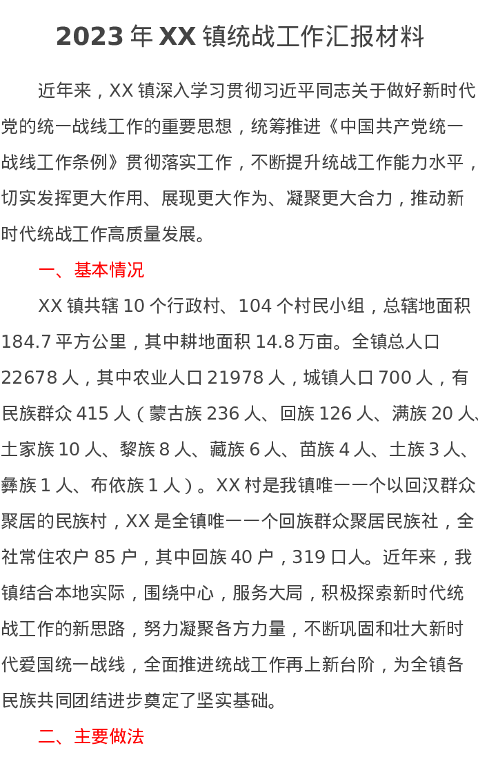 2023年XX镇统战工作汇报材料