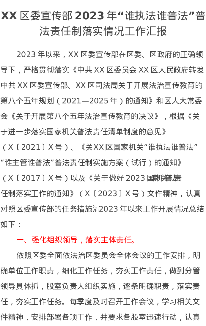 XX区委宣传部2023年“谁执法谁普法”普法责任制落实情况工作汇报