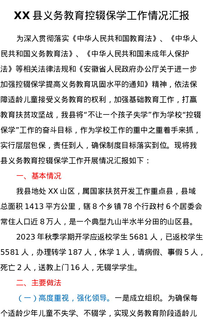 XX县义务教育控辍保学工作情况汇报
