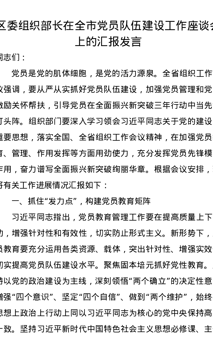 区委组织部长在全市党员队伍建设工作座谈会上的汇报发言