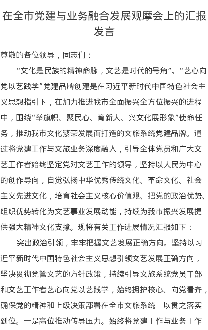 在全市党建与业务融合发展观摩会上的汇报发言