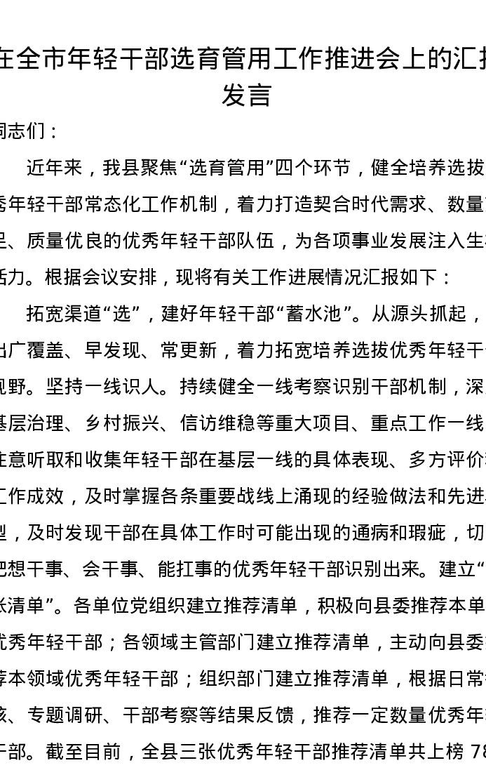 在全市年轻干部选育管用工作推进会上的汇报发言