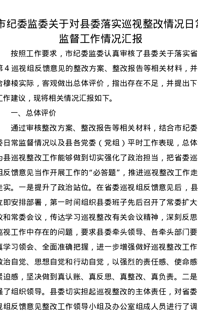 市纪委监委关于对县委落实巡视整改情况日常监督工作情况汇报