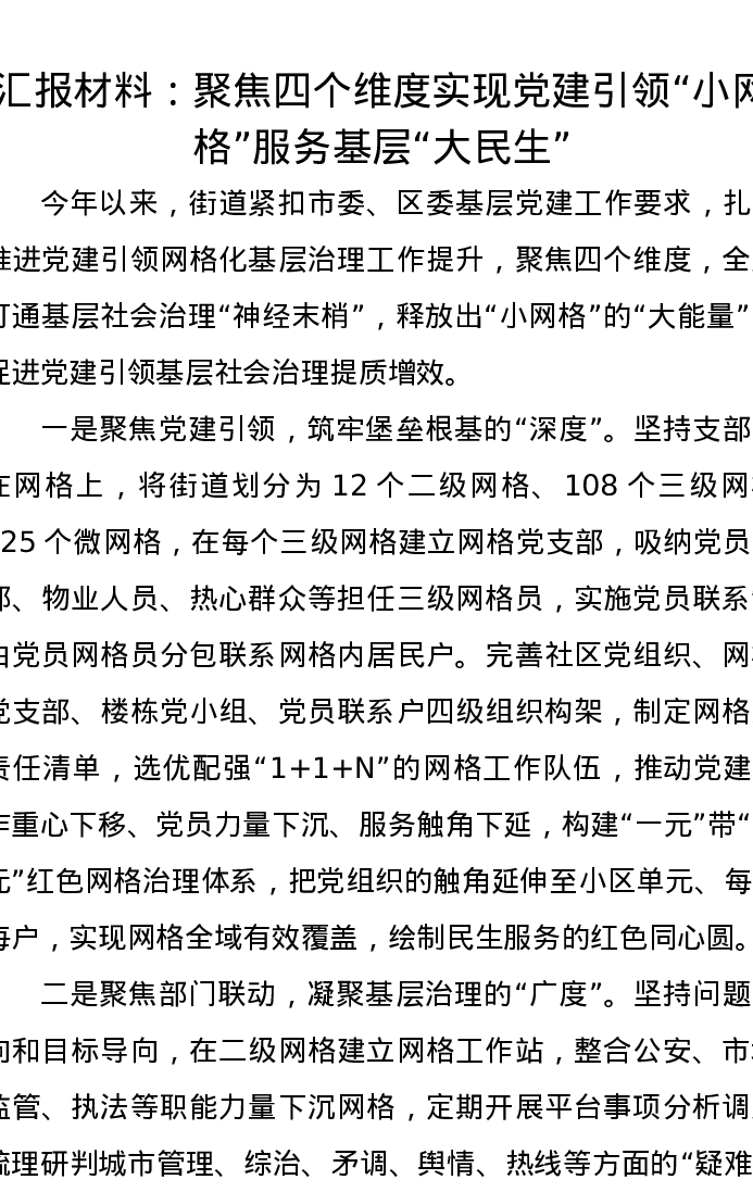 汇报材料:聚焦四个维度实现党建引领“小网格”服务基层“大民生”