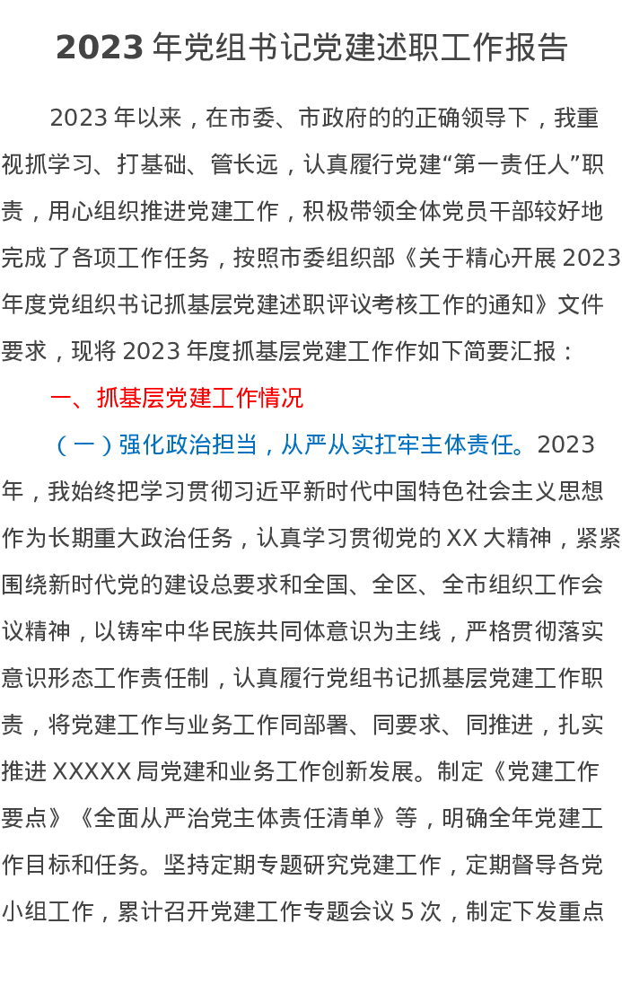 2023年党组书记党建述职工作报告