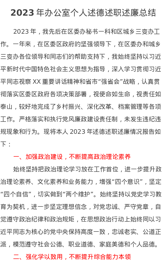 2023年办公室个人述德述职述廉总结
