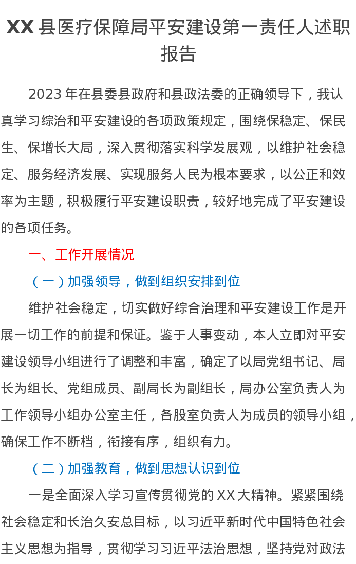 XX县医疗保障局平安建设第一责任人述职报告