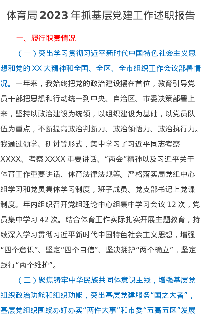 体育局2023年抓基层党建工作述职报告