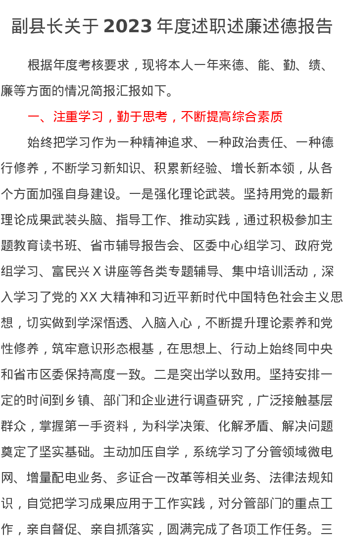 副县长关于2023年度述职述廉述德报告