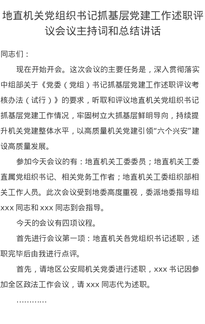 地直机关党组织书记抓基层党建工作述职评议会议主持词和总结讲话