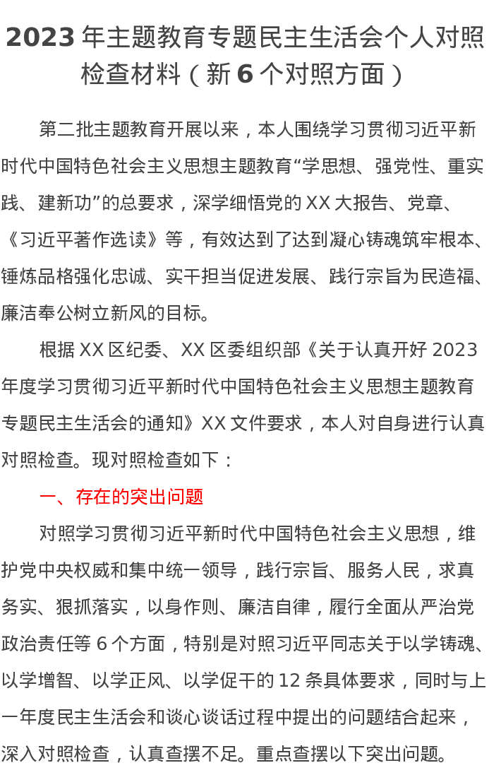 (新6个对照)2023年主题教育专题民主生活会个人对照检查材料特色社会主义思想