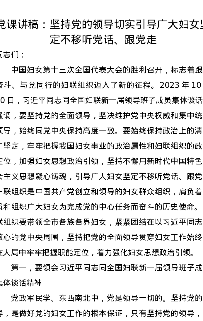 党课讲稿:坚持党的领导切实引导广大妇女坚定不移听党话、跟党走