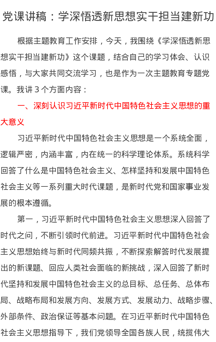 党课讲稿:学深悟透新思想实干担当建新功