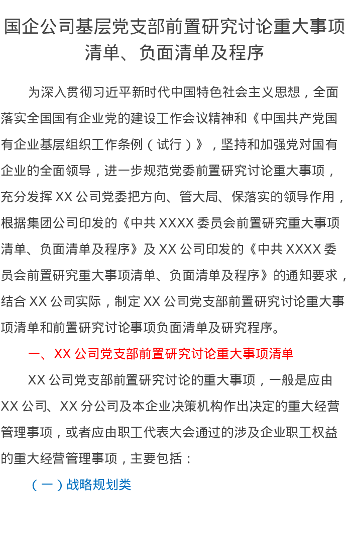 国企公司基层党支部前置研究讨论重大事项清单、负面清单及程序