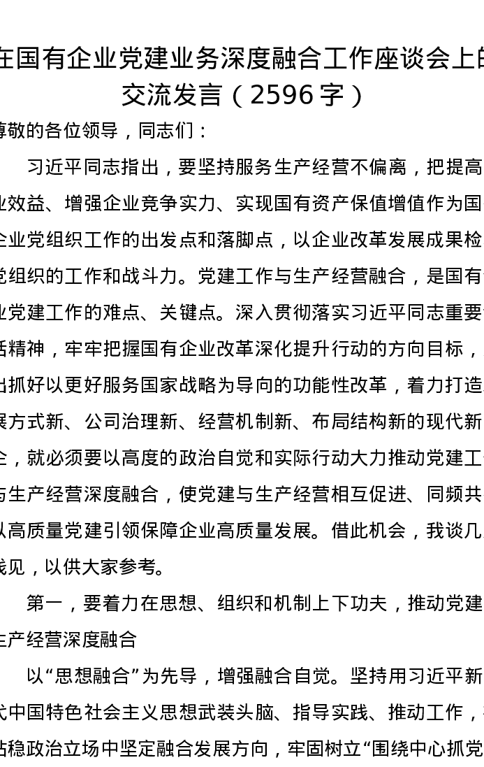在国有企业党建业务深度融合工作座谈会上的交流发言