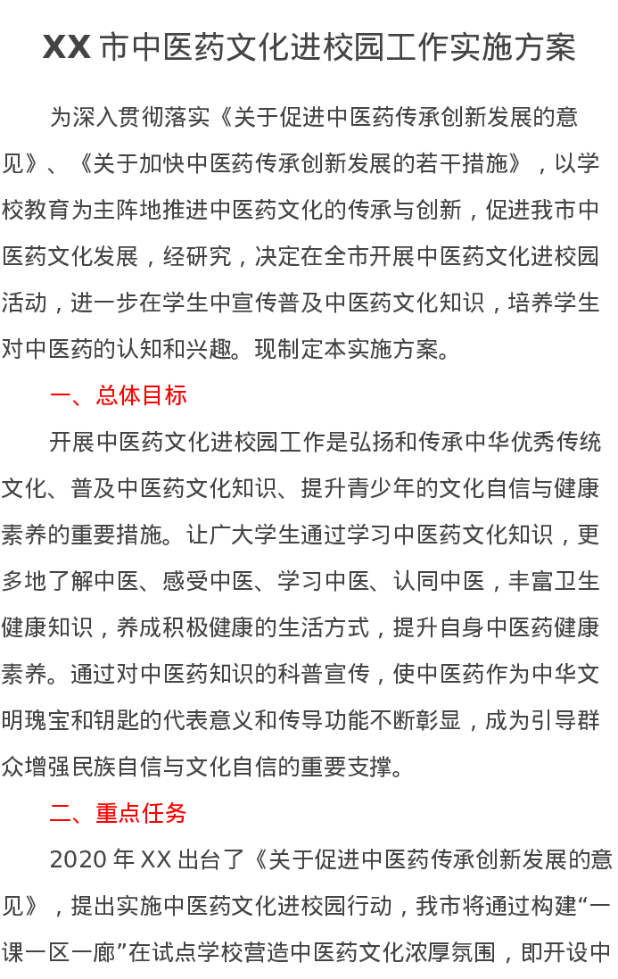XX市中医药文化进校园工作实施方案