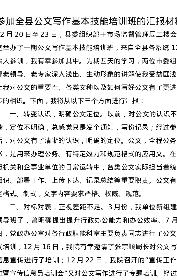 参加全县公文写作基本技能培训班的汇报材料