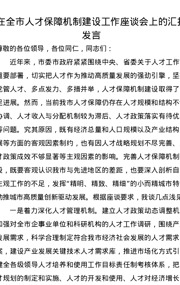 在全市人才保障机制建设工作座谈会上的汇报发言