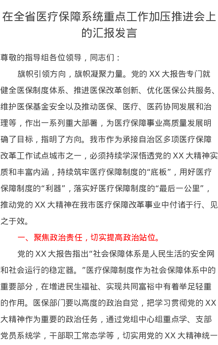 在全省医疗保障系统重点工作加压推进会上的汇报发言