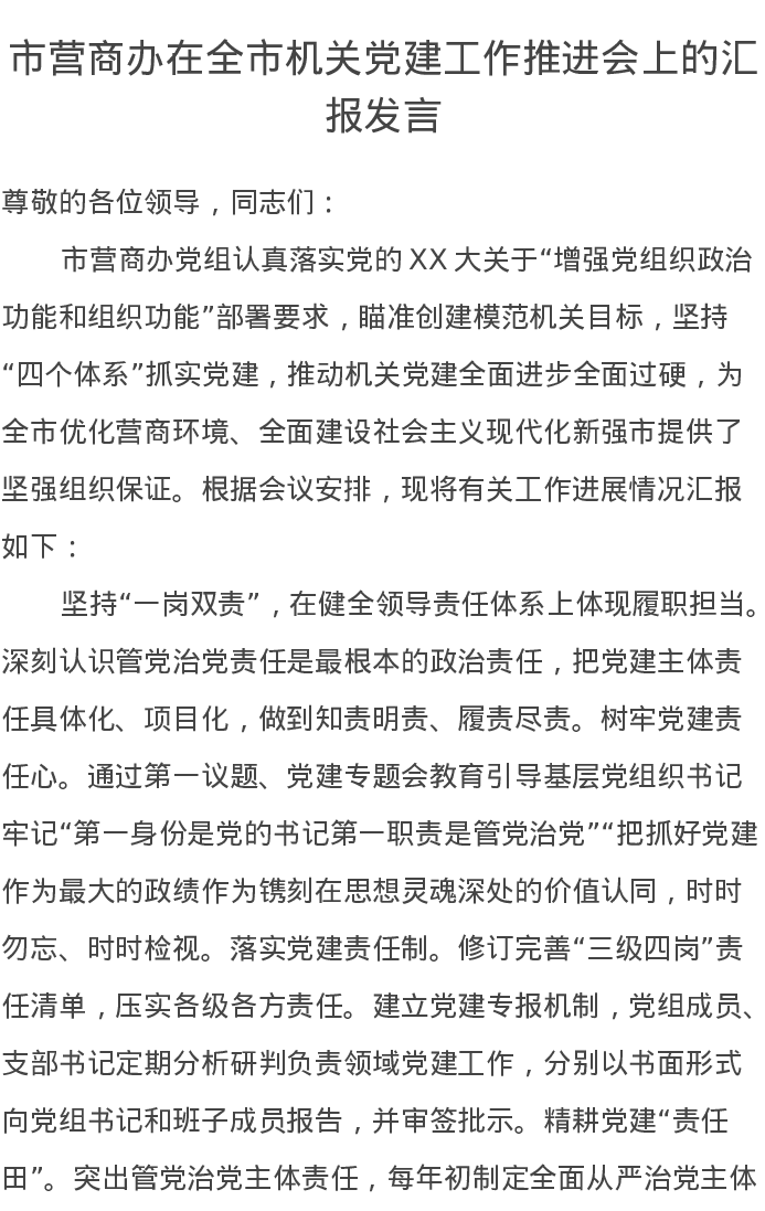 市营商办在全市机关党建工作推进会上的汇报发言