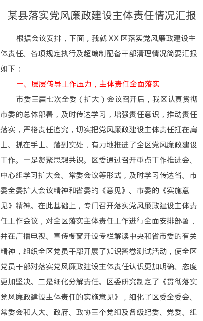 某县落实党风廉政建设主体责任情况汇报