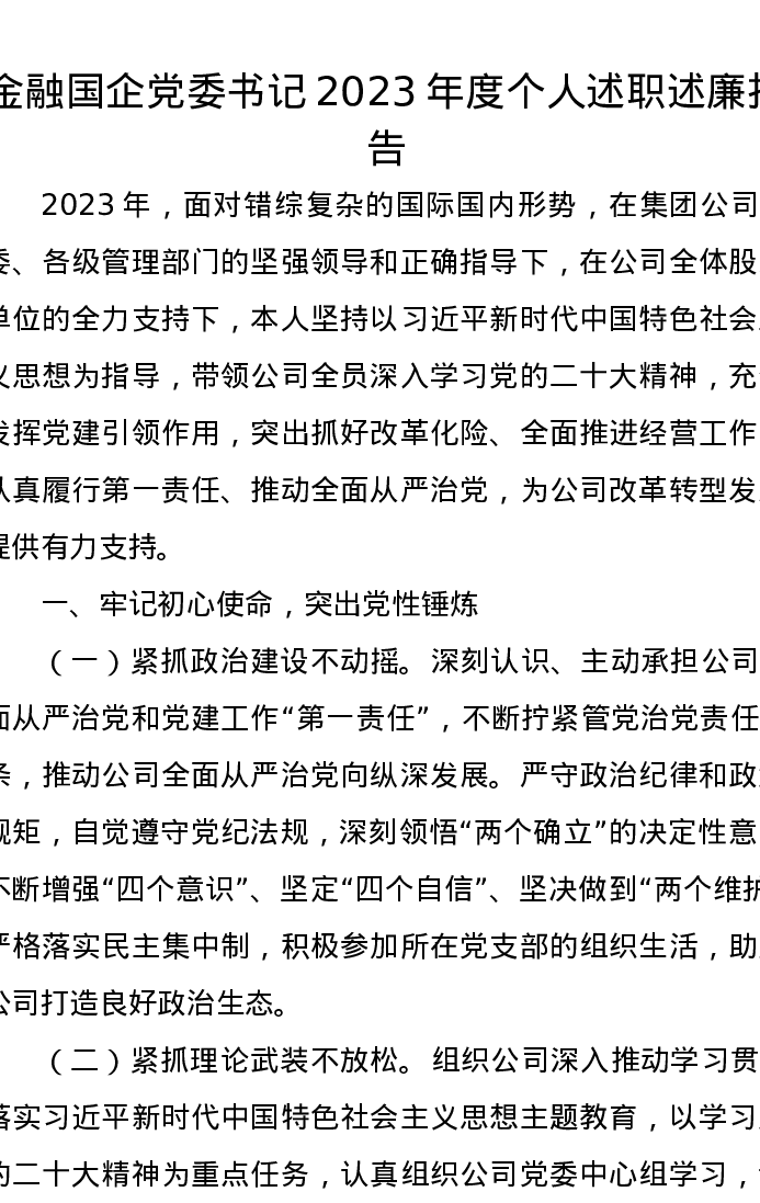 金融国企党委书记2023年度个人述职述廉报告