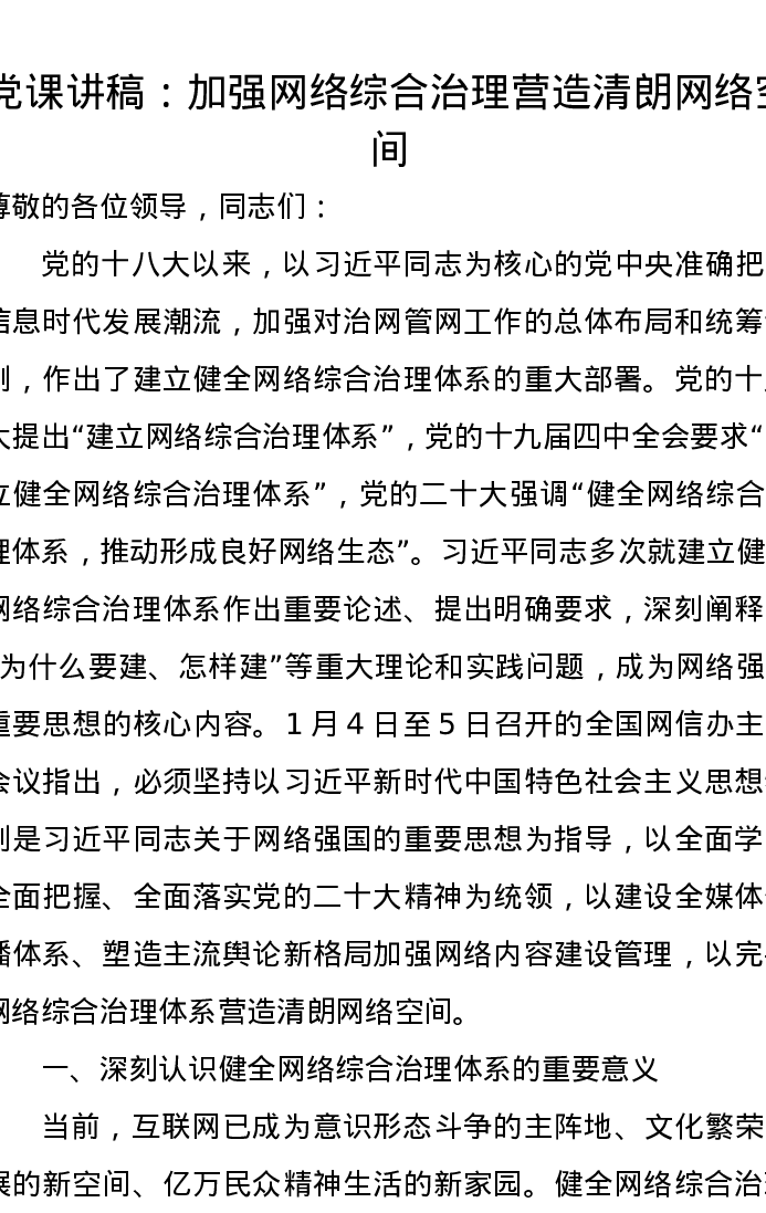 党课讲稿:加强网络综合治理营造清朗网络空间