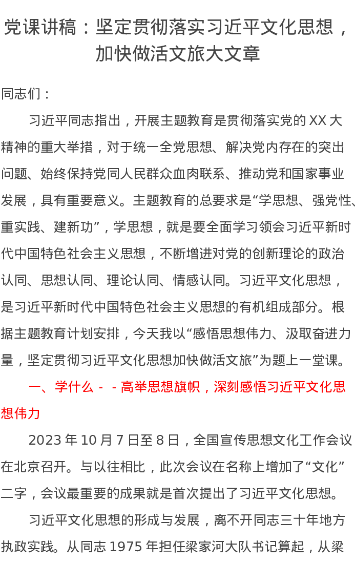 党课讲稿:坚定贯彻落实习近平文化思想,加快做活文旅大文章