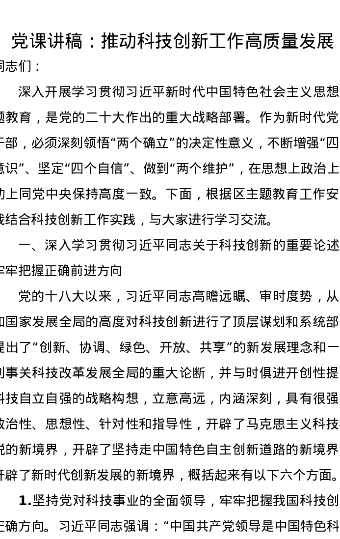 党课讲稿:推动科技创新工作高质量发展
