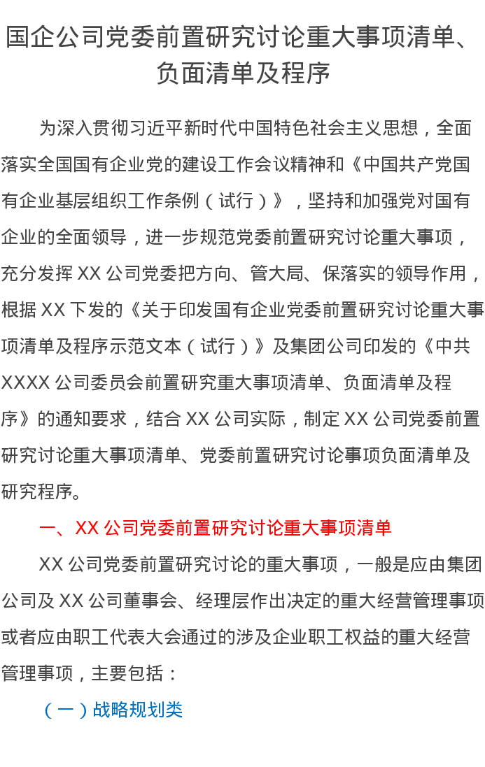 国企公司党委前置研究讨论重大事项清单、负面清单及程序