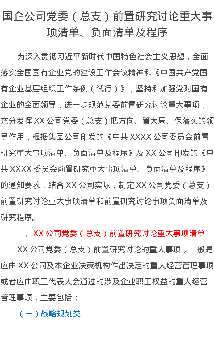 国企公司党委(总支)前置研究讨论重大事项清单、负面清单及程序