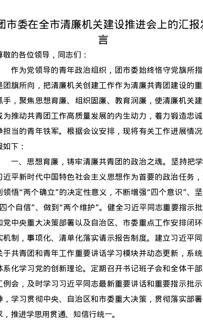 团市委在全市清廉机关建设推进会上的汇报发言